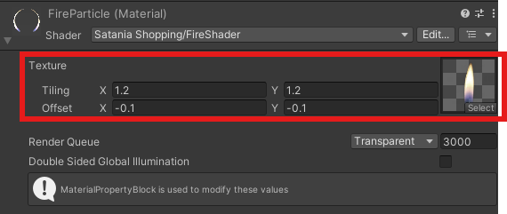 さたにあ式タバコでは炎の表現に専用シェーダーを使用していて、テクスチャが歪んで揺れているような表現になります。そのため、揺れた際にはみ出ないようにするためにTillingとOffsetを編集しています。
