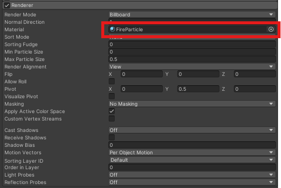 パーティクルシステムの細かい説明は省きますが、マテリアルを編集したい場合は、Renderer欄のMaterialを変更してください。